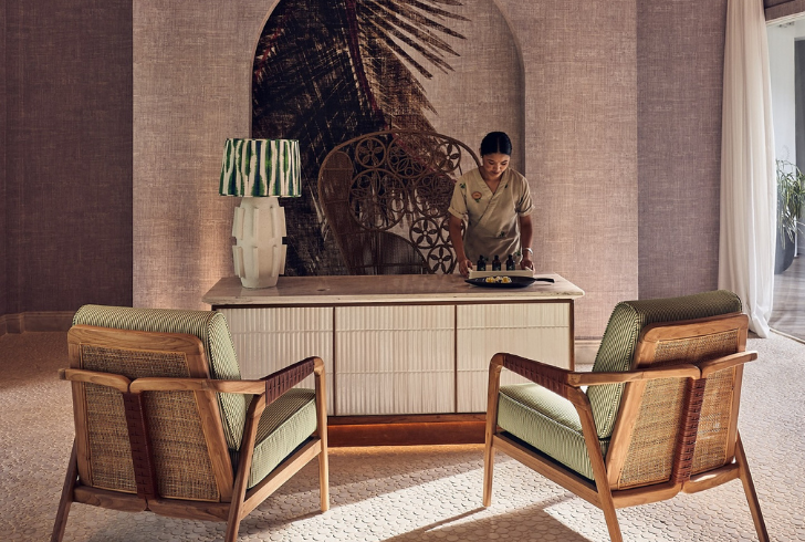 British design studio Muza Lab shaped the interiors. Designers Inge Moore and Nathan Hutchins drew on the textures and colors of the Maldives. Carved wood, stone, and marble blend with references to traditional Dhoni boats and Feyli sarongs. The result is a style that honors local heritage while presenting an international level of sophistication.
